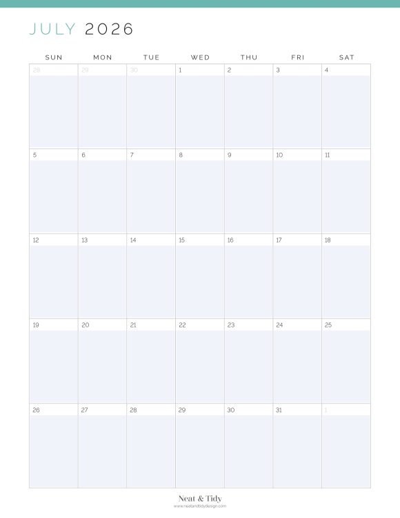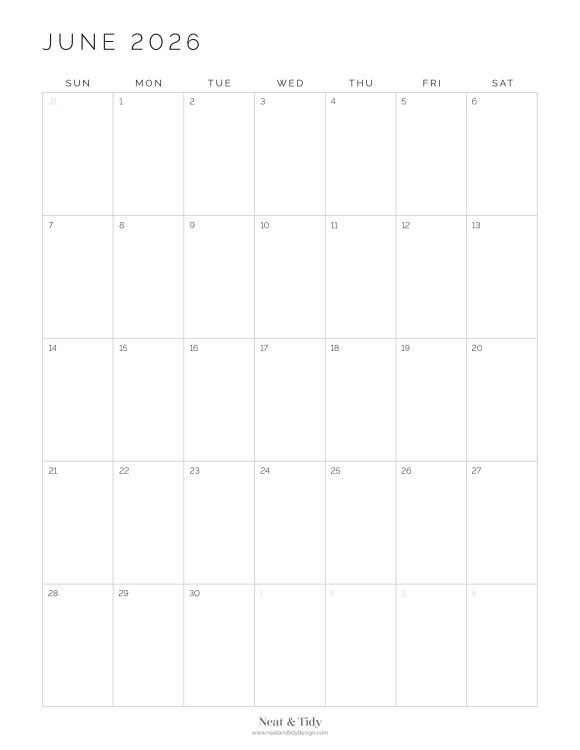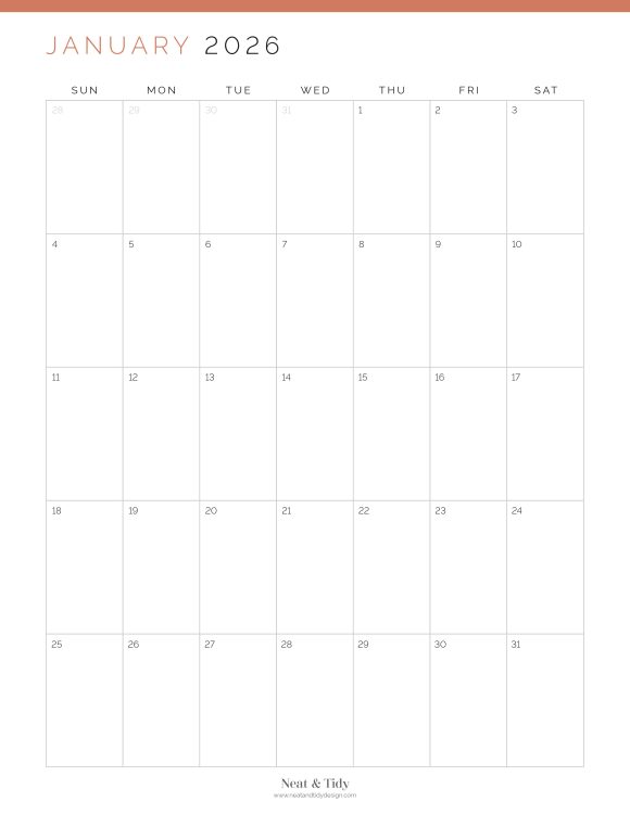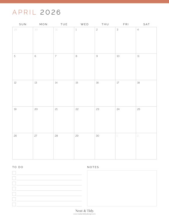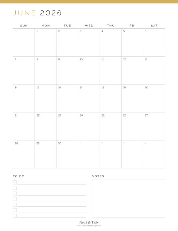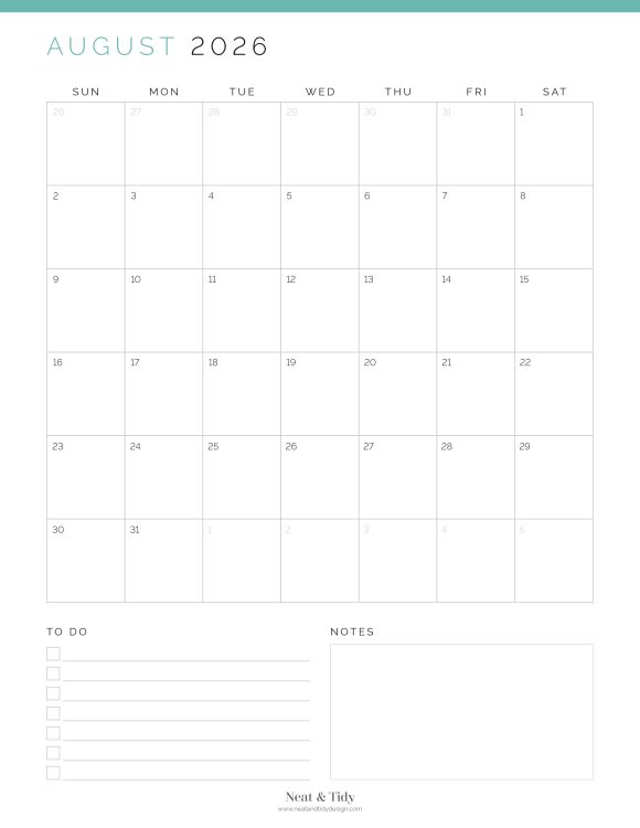 A dated monthly planner for 2026, comes in two versions; one with a section for notes and to do list below the calendar on each page and one without.