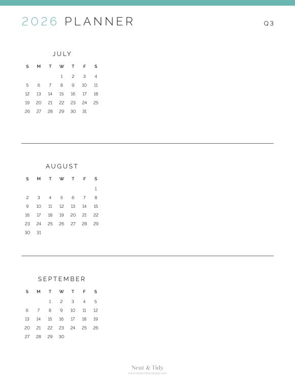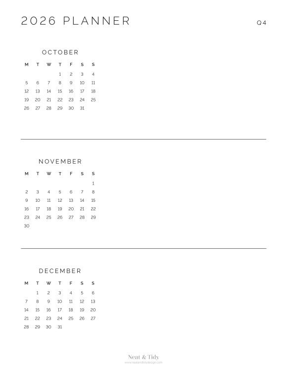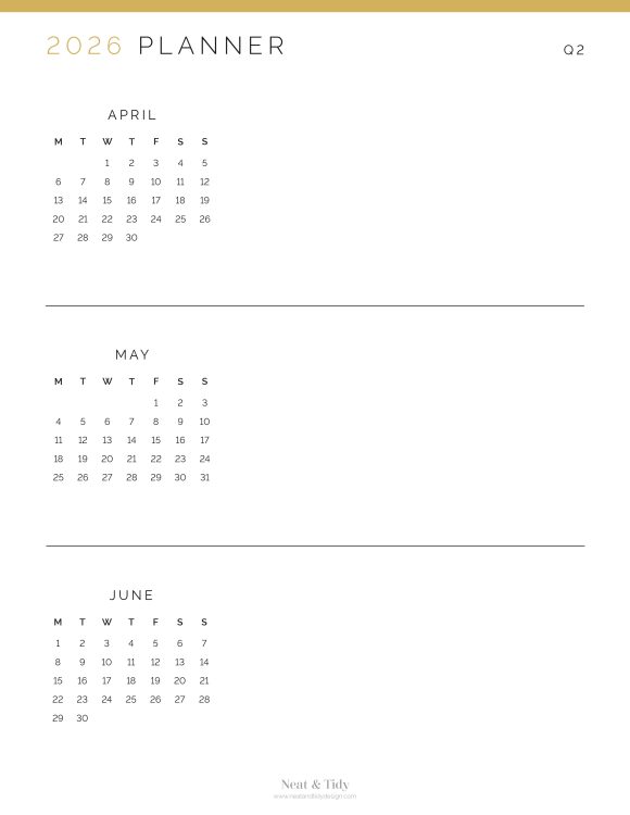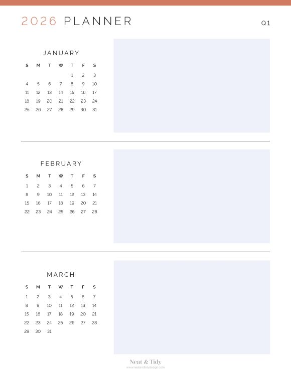 Plan your year in quarters with this clean and simple printable Quarterly Planner. This is a 4-page document, with one quarter per page. Featuring a small monthly overview calendar and one large text field per month. Use this page to track important dates, seasonal goals, deadlines, and events all in one place.