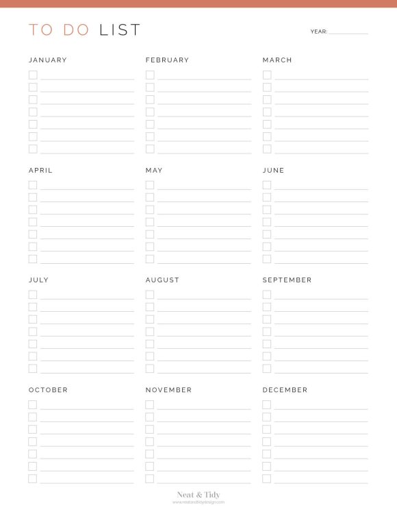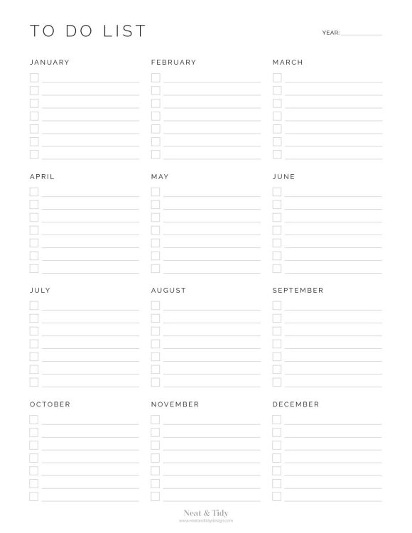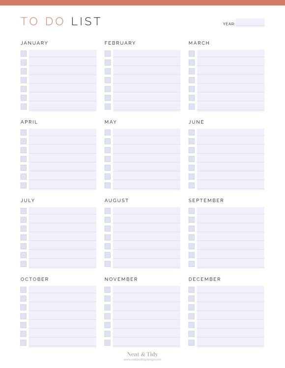 A yearly to do list giving you an overview of all the tasks you need to do each month of the year. Each month has space for 7 tasks.