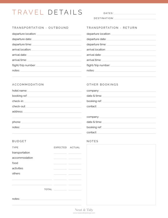 Keep track of flight information, hotel bookings and transportation bookings with this travel details printable. Comes in two different layouts. Version two also includes a budget section so you can track all your important travel information on one page. Print one for yourself and another copy for anyone that might need access to your travel details such as friends or family members or house sitters.