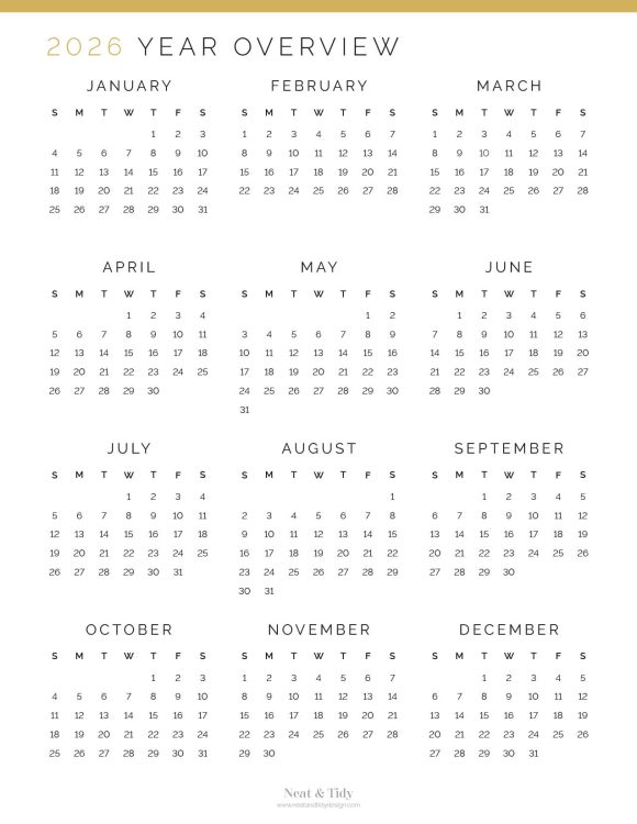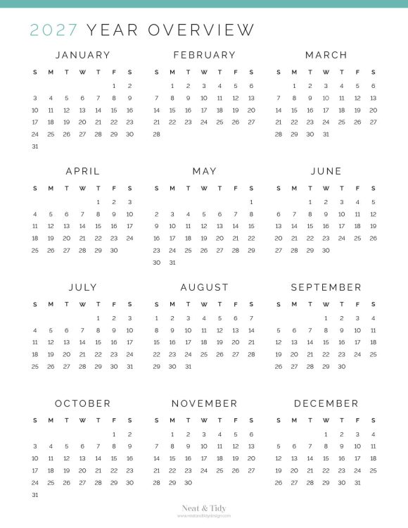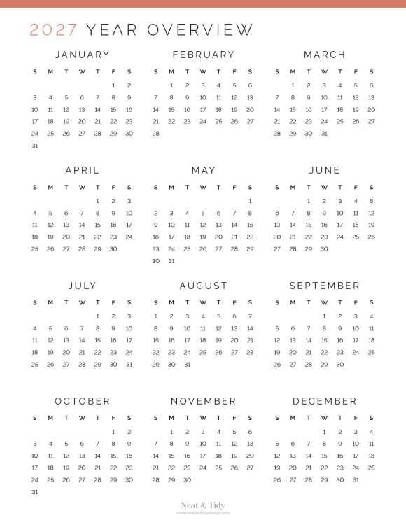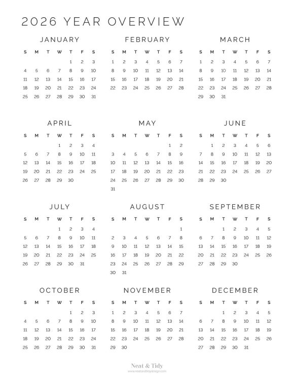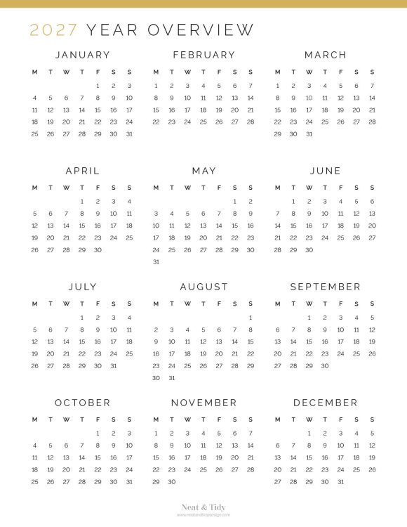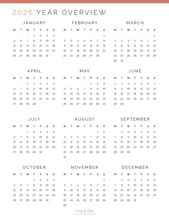 A printable Year Overview page for 2026 and 2027 in US Letter and A4 size. Each paper size comes with either a Monday or Sunday start to the week. Perfect addition to your personal or business planner to get a quick overview of the year.