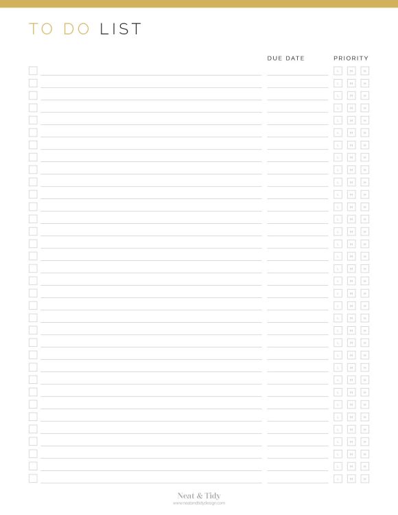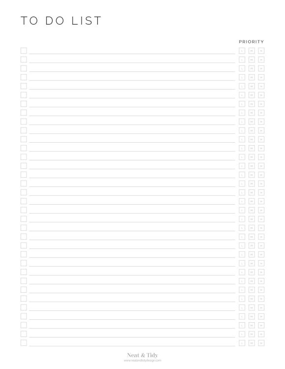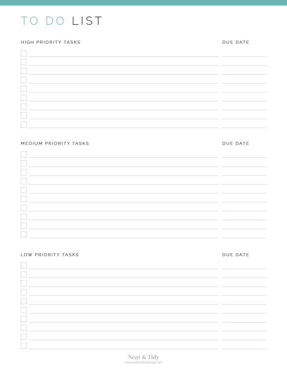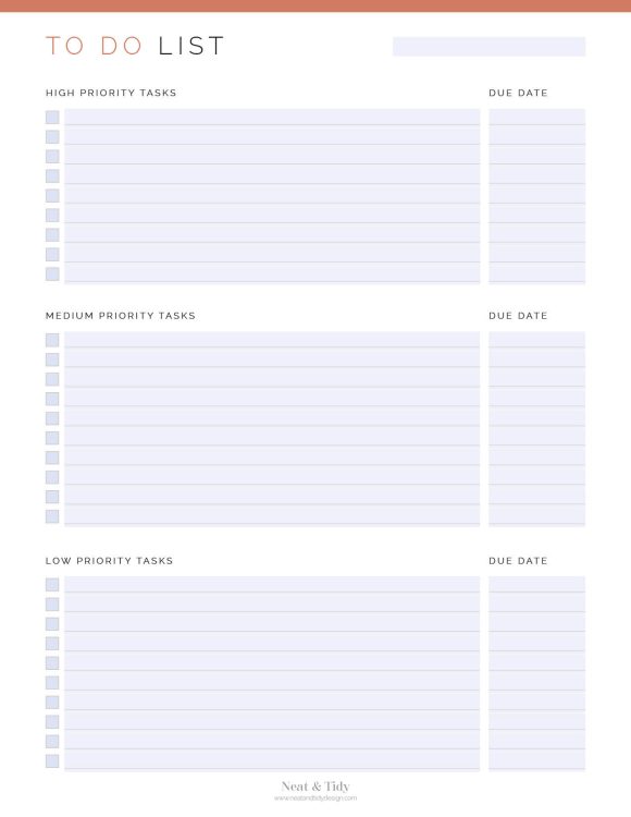 - Version 3 – Three task lists on one page, divided into High Priority, Medium Priority, Low priority with due dates